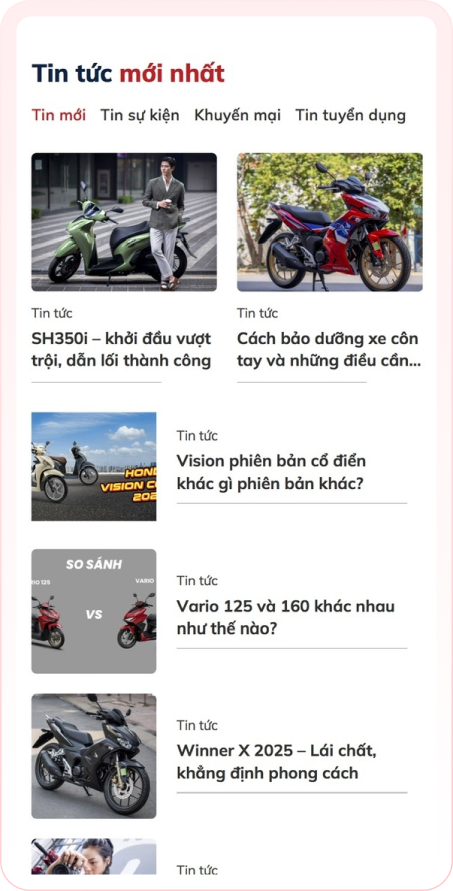 Hệ thống sản phẩm được phân loại rõ ràng theo hãng xe như Honda, Yamaha, SYM và theo loại xe như xe số, xe ga, xe côn tay. Trang chi tiết sản phẩm hiển thị đầy đủ thông số kỹ thuật, hình ảnh thực tế, giá bán và các chương trình khuyến mãi – giúp khách hàng dễ dàng so sánh, lựa chọn và đưa ra quyết định mua hàng.