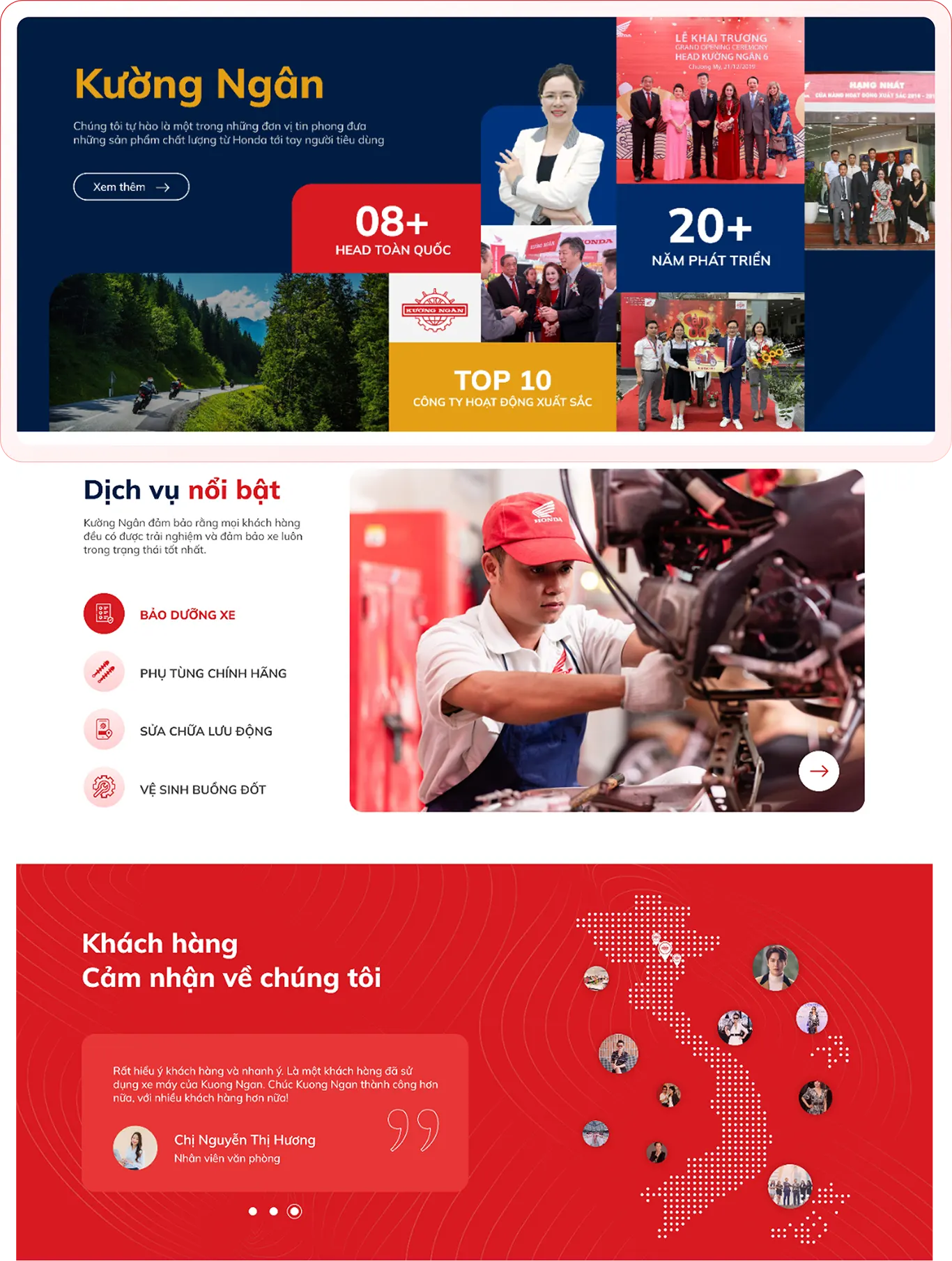 Website cũng được tối ưu chuẩn SEO Onpage, sử dụng các từ khóa chiến lược như “mua xe máy Honda chính hãng”, “đại lý xe máy uy tín tại Hà Nội”, giúp Kường Ngân nâng cao khả năng hiển thị trên Google và thu hút thêm lượng khách hàng tiềm năng. Đồng thời, mã nguồn và hình ảnh được tối ưu hóa để đảm bảo tốc độ tải trang nhanh, góp phần nâng cao trải nghiệm và giảm tỷ lệ thoát trang.