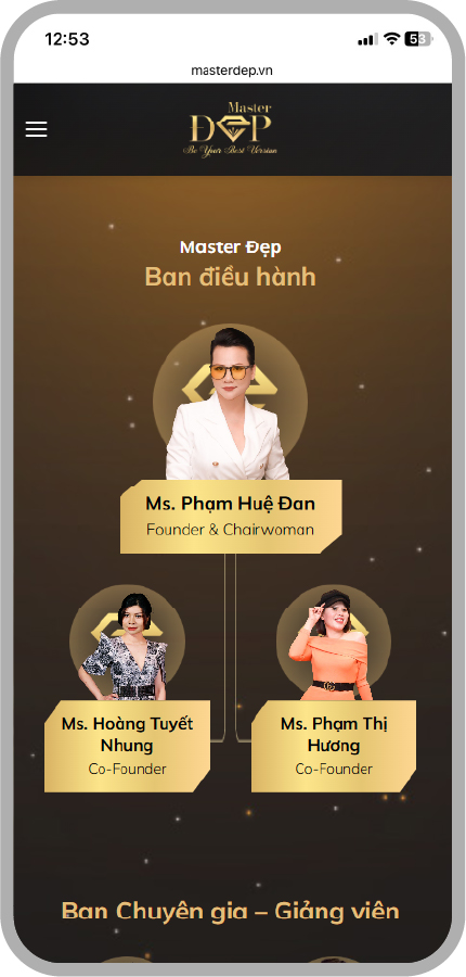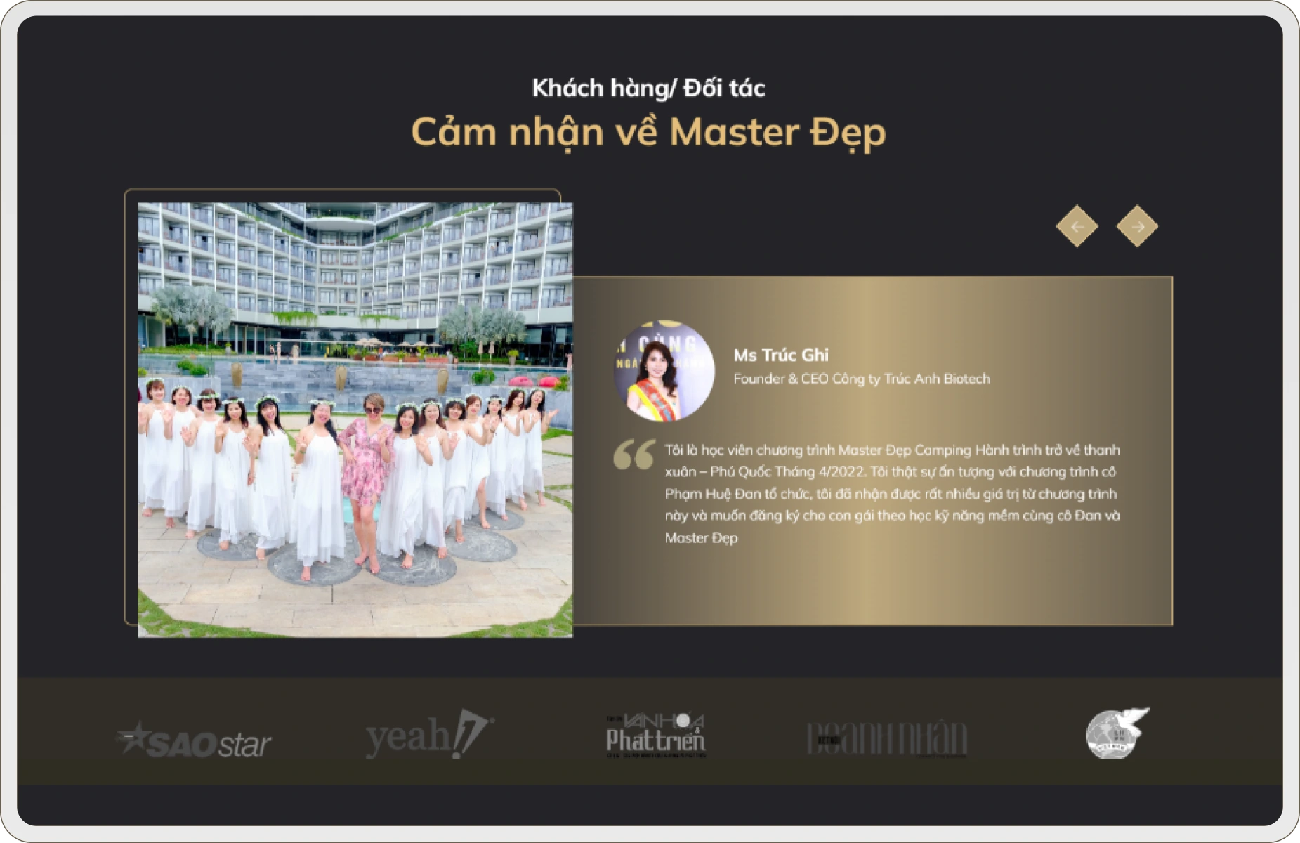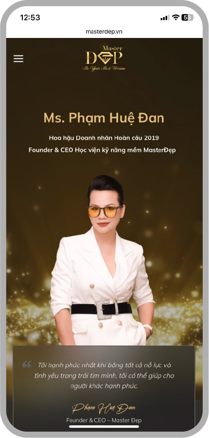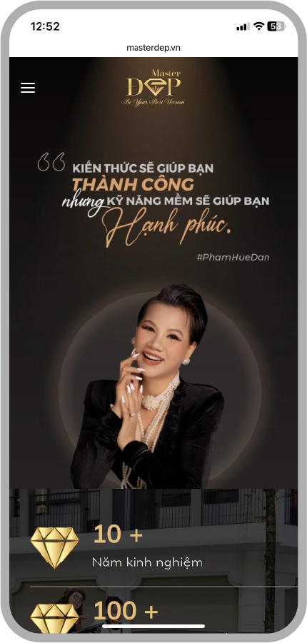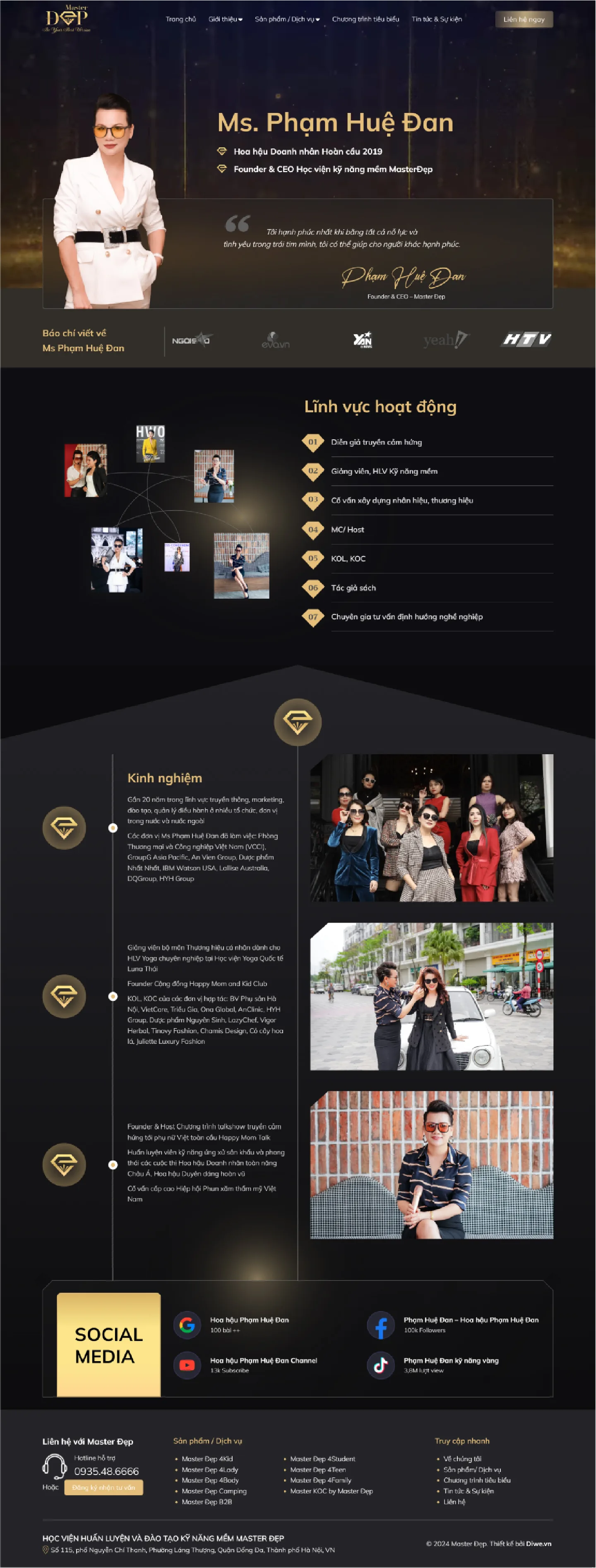 Dự án thiết kế website cho Master Đẹp Academy - Học viện đào tạo kỹ năng mềm uy tín tại Hà Nội, do CEO Phạm Huệ Đan (Hoa hậu Doanh nhân Hoàn cầu) sáng lập. Với hơn 10 năm kinh nghiệm và 1.000+ học viên, Master Đẹp chuyên cung cấp các chương trình như Master KOC, 4Kid, 4Teen, 4Lady... hướng tới các đối tượng đa dạng: doanh nhân, nữ lãnh đạo, học sinh, sinh viên… Website mới nhằm truyền tải rõ triết lý “trả lại giá trị cho cuộc sống”, đồng thời mở rộng thị trường và thu hút học viên trên nền tảng số.