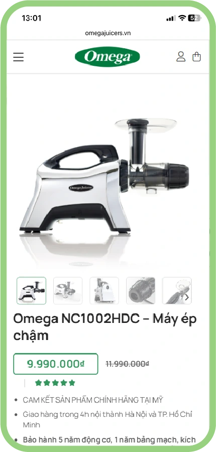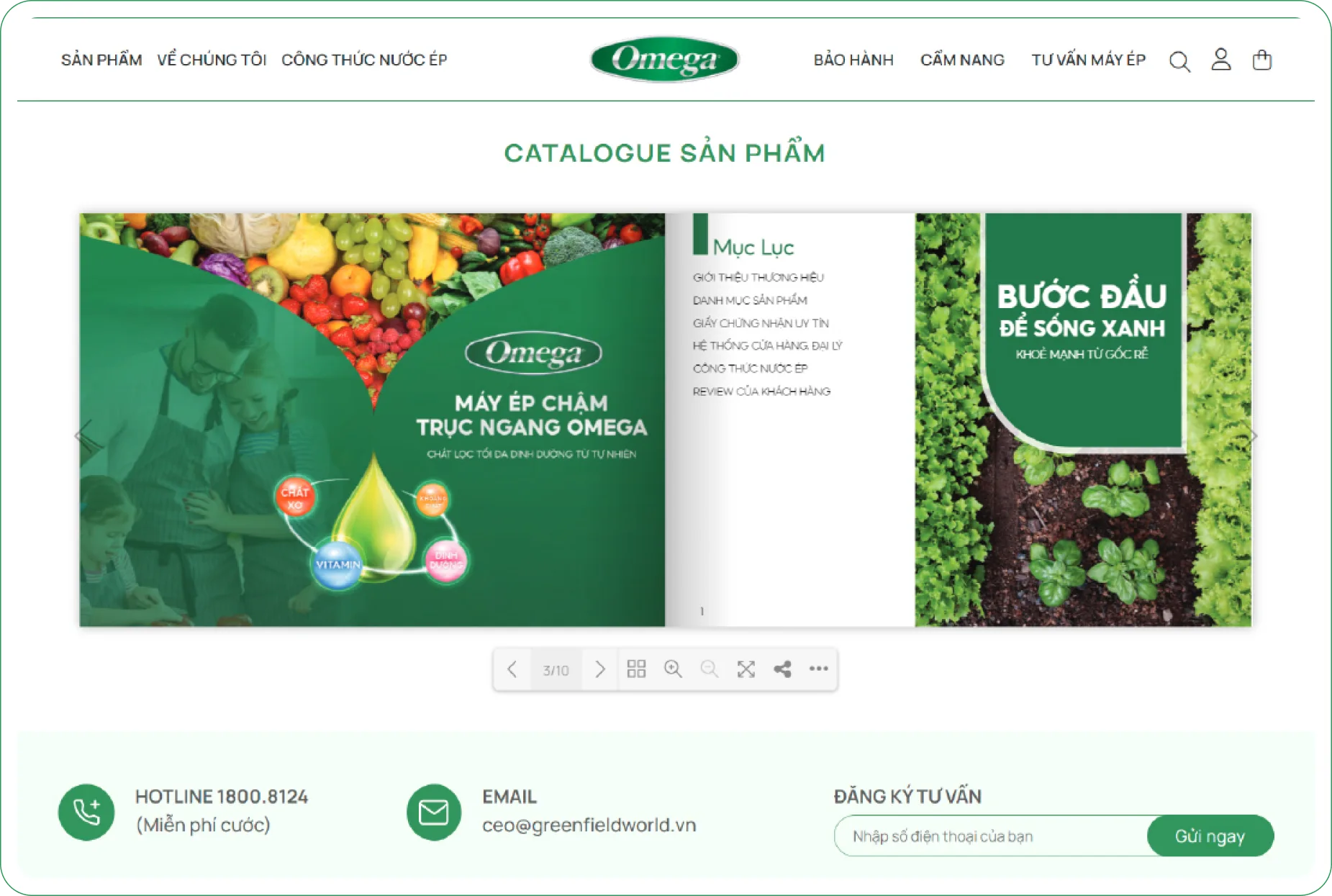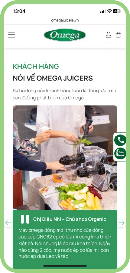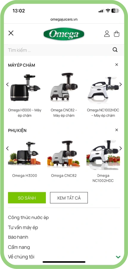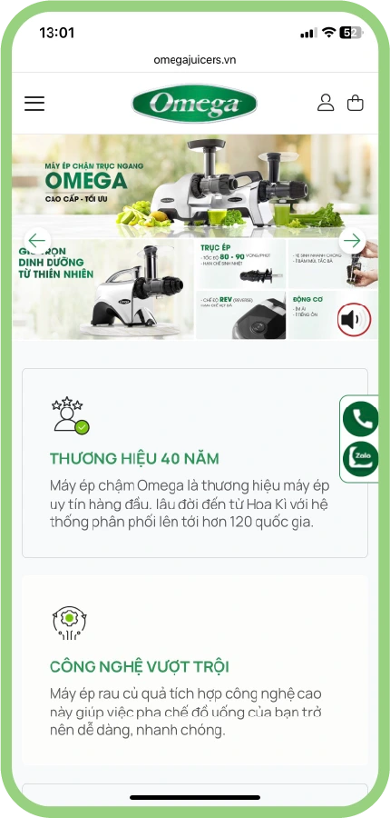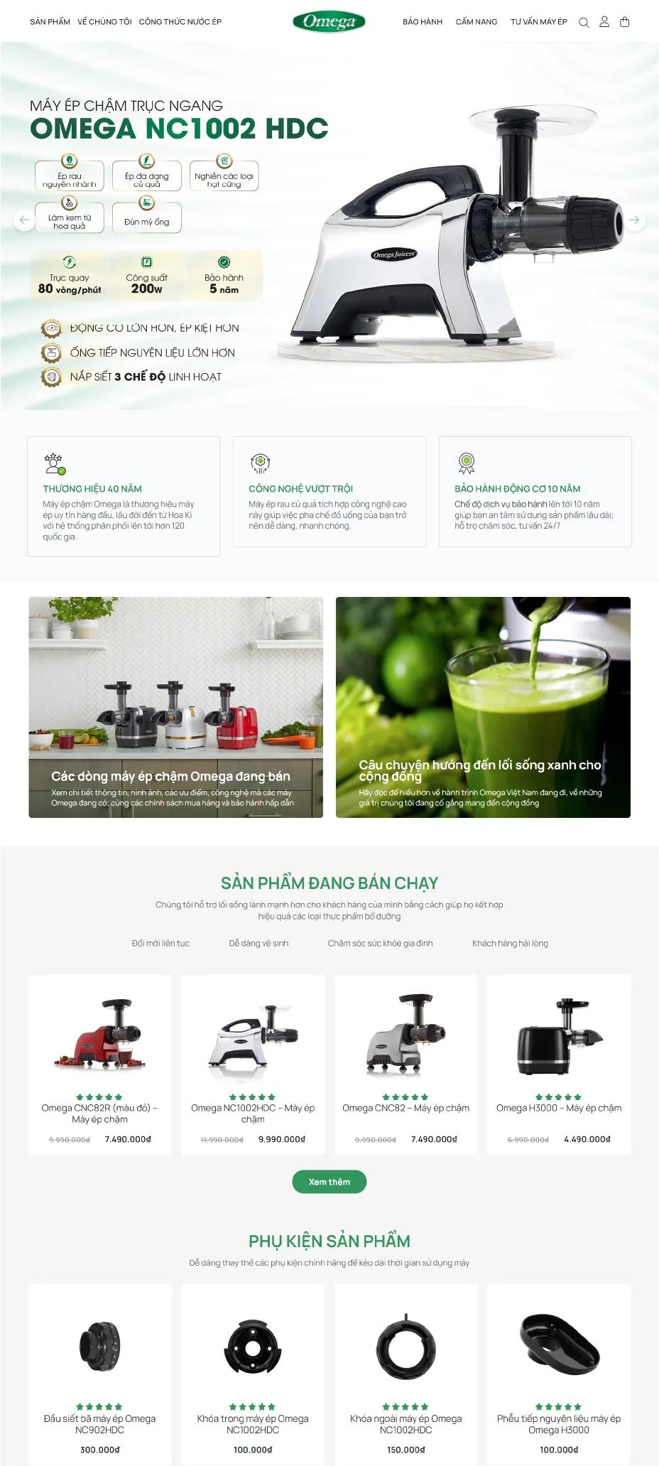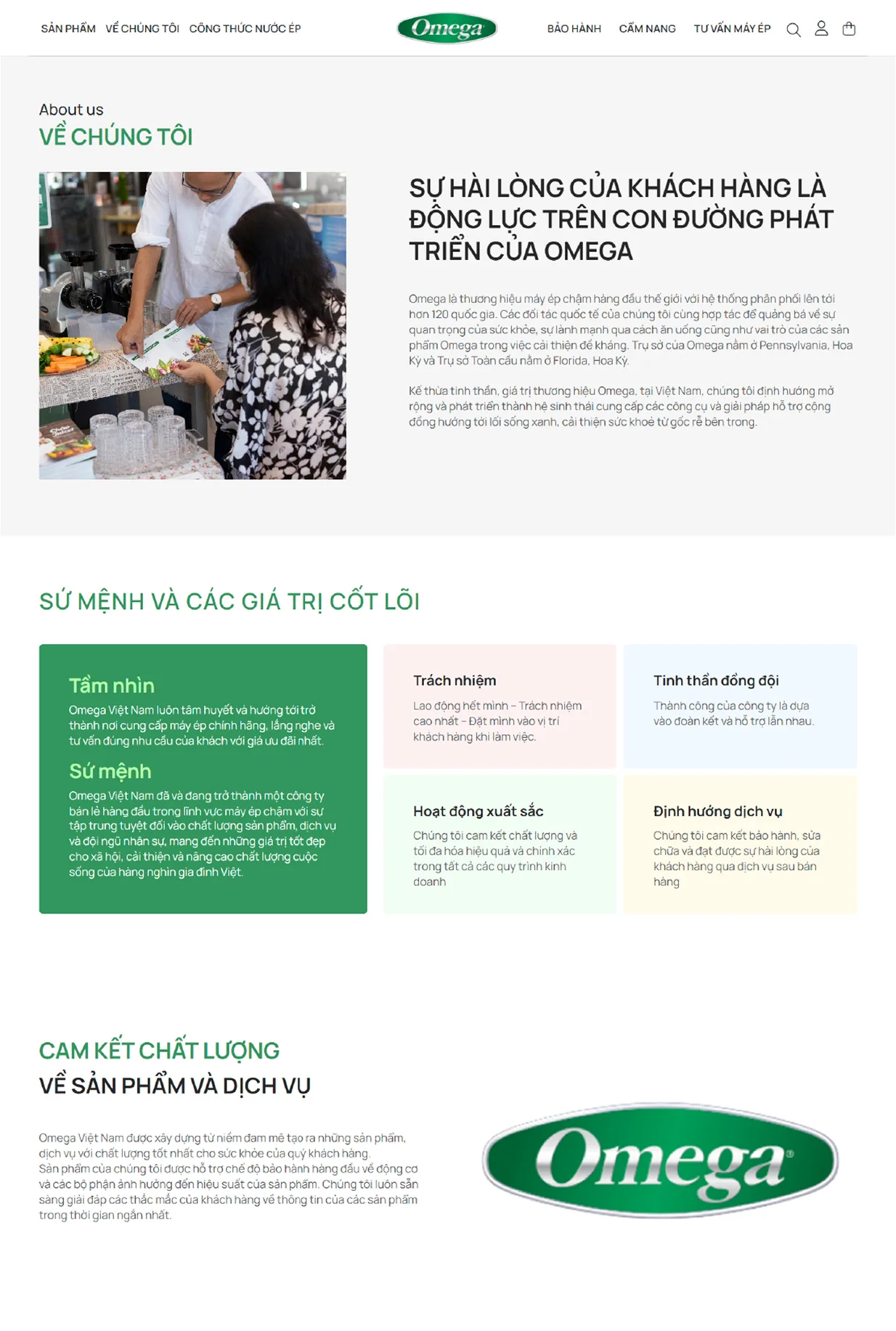 Omega Juicers Việt Nam yêu cầu website thể hiện rõ từng dòng sản phẩm, hướng dẫn cách dùng & vệ sinh, chia sẻ công thức/recipe, tích hợp nút tư vấn và đặt hàng nhanh, giao diện thân thiện với thiết bị di động, và phải tối ưu SEO để tiếp cận người dùng quan tâm đến máy ép chậm, ép rau củ, sống khỏe và chế độ dinh dưỡng.