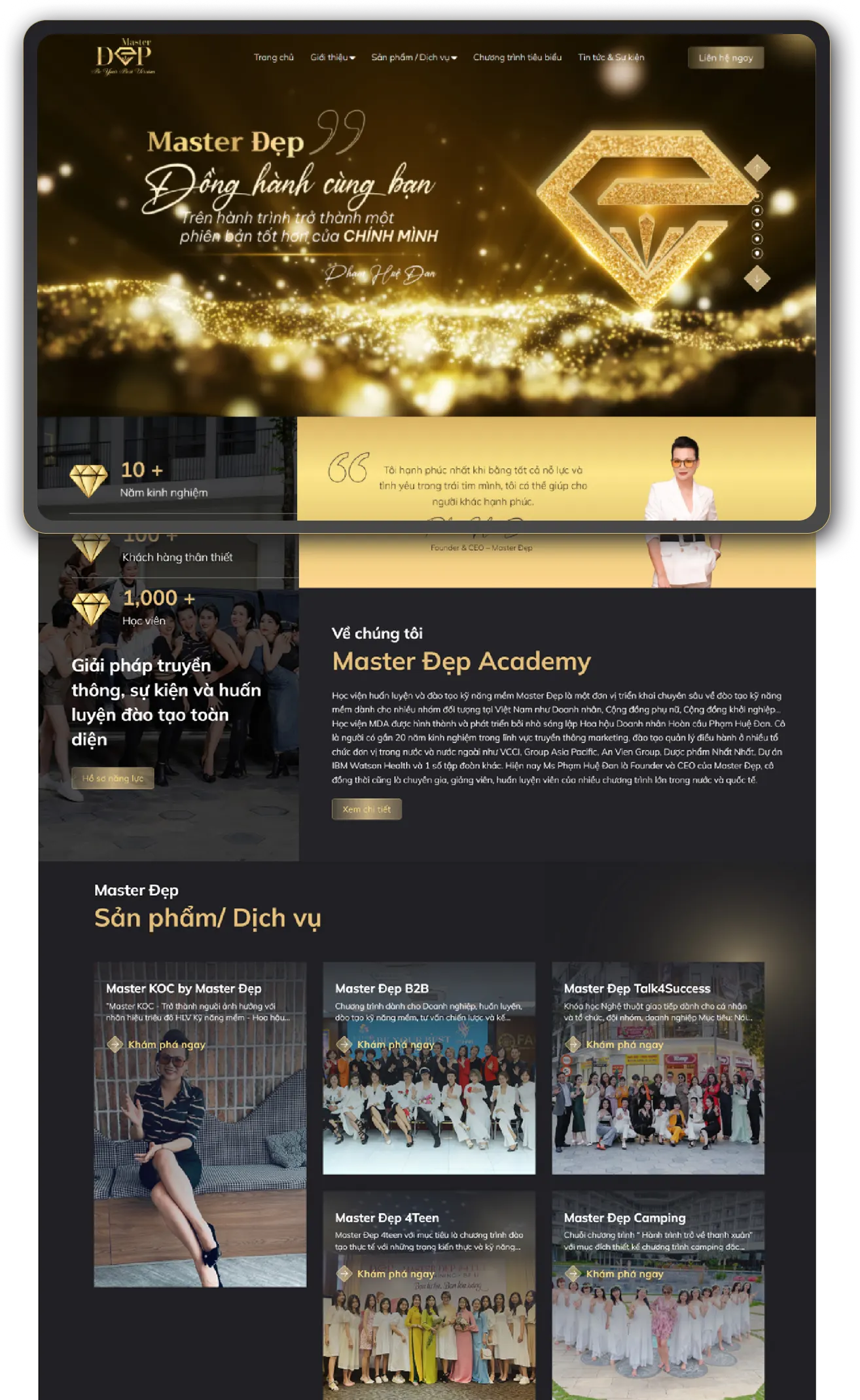 Dự án thiết kế website cho Master Đẹp Academy - Học viện đào tạo kỹ năng mềm uy tín tại Hà Nội, do CEO Phạm Huệ Đan (Hoa hậu Doanh nhân Hoàn cầu) sáng lập. Với hơn 10 năm kinh nghiệm và 1.000+ học viên, Master Đẹp chuyên cung cấp các chương trình như Master KOC, 4Kid, 4Teen, 4Lady... hướng tới các đối tượng đa dạng: doanh nhân, nữ lãnh đạo, học sinh, sinh viên… Website mới nhằm truyền tải rõ triết lý “trả lại giá trị cho cuộc sống”, đồng thời mở rộng thị trường và thu hút học viên trên nền tảng số.